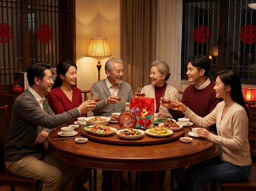 图4:除夕阖家团圆夜,家人举杯人头马X.O,家宴的亲情暖意和新春的美好祝愿在此刻汇聚于杯盏之间